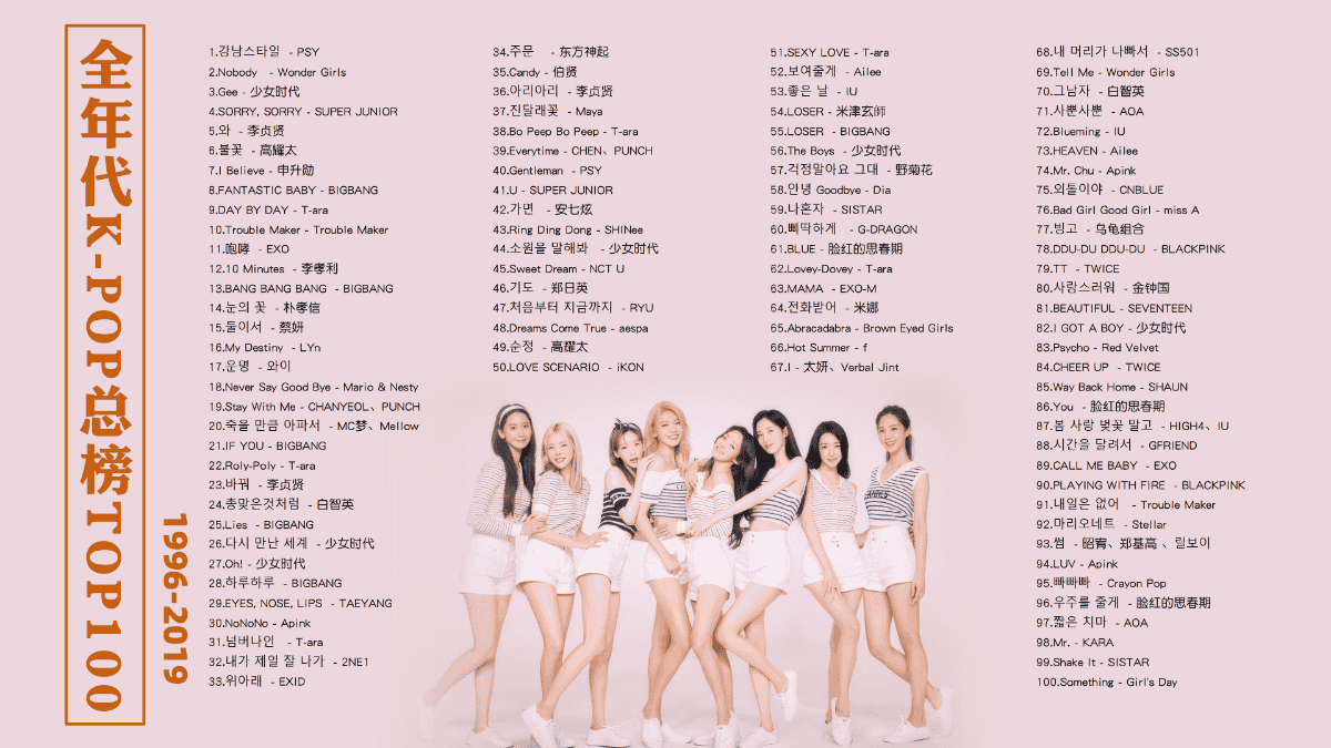 【1996-2019年K-POP历史总榜TOP100歌曲带歌词】韩流永不落幕!全年代K-POP历史总榜TOP100[MP3/0.85G]